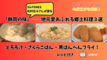 キクエがキクヨ! 【キクエがキクヨ】SixTONES松村北斗さんが語る「静岡の味」──地元愛あふれる郷土料理3選 とろろ汁・さくらごはん・黒はんぺんフライ!レシピ付き SixTONESのメンバーであり、俳優としても数々の映画・ドラマで活躍している松村北斗さん。今日のめざましどようび「キクエがキクヨ」では、静岡県出身の彼が、地元の「ソウルフード」を語り、懐かしい郷土料理を心ゆくまで堪能しました。 2025.10.04 キクエがキクヨ!食べる