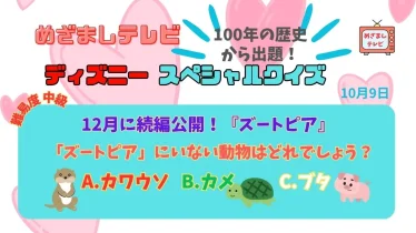 Disney めざましテレビ『ズートピア』続編公開目前!ディズニーSPクイズに挑戦|10月9日 今回のテーマは、 今年12月に続編が公開される話題作『ズートピア』。難易度は中級。動物たちの楽園を舞台にした名作からの出題でした。 2025.10.09 Disneyエンタメ