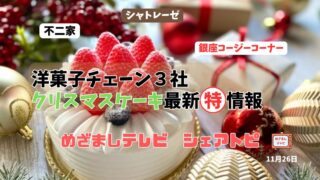 今ならお得な特典で華やかなケーキを♪11月26日のめざましテレビのシェアトピ 『洋菓子チェーン3社 クリスマスケーキ最新情報』甘いクリスマスケーキと過ごす時間が幸せなものでありますように。