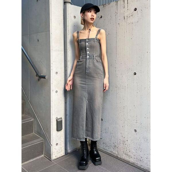 ワンピースのデザインベルトの位置が高めなので脚長効果があります。また、今年はストラップを細くすることで重ね着しやすいようになりました。黒のトップスをレイヤードした綺麗めコーデやシャツを羽織ったデコルテ見せも