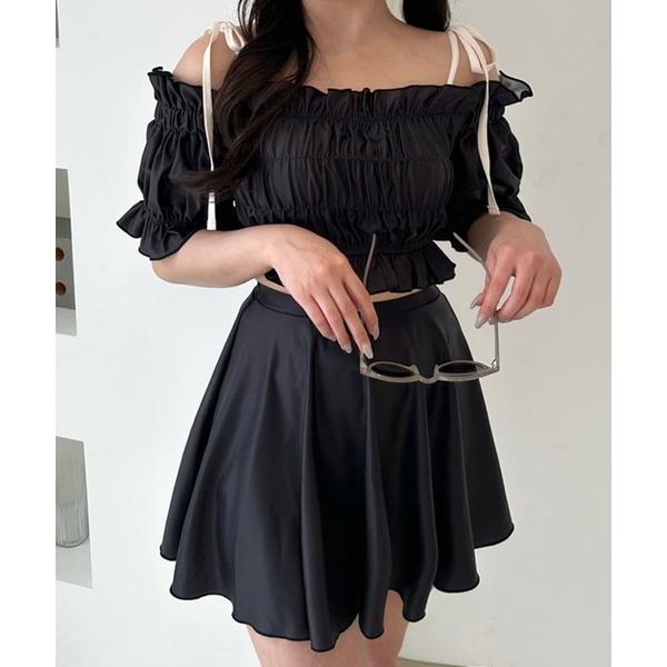まるで洋服を着ているような感覚のオリーブの新作水着。露出控えめのオフショルダーデザインで、肩には可愛らしいリボンが付いています。胸元はスッキリ見せてくれるシャーリング、スカートは程よい丈感で気になるポイントを隠し、スッキリとした着心地を実現しています。カラーバリエーションも豊富で、シックなブラック、可愛らしいミント、大人っぽいサックスブルーなど、お好みの色を選べます。