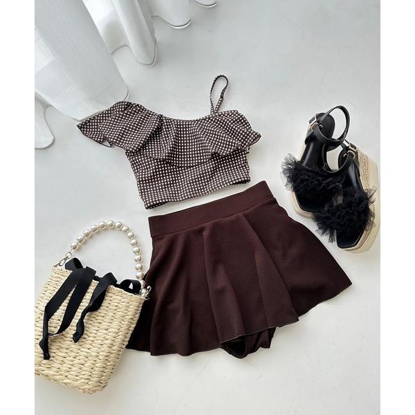 3点セット水着は、トップス、ボトムス、スカートの3点で構成された、リゾートシーンにぴったりのアイテムです。水着としてはもちろん、リゾートワンピースとしても着用できるデザインなので、シーンに合わせて様々な着こなしを楽しめます。