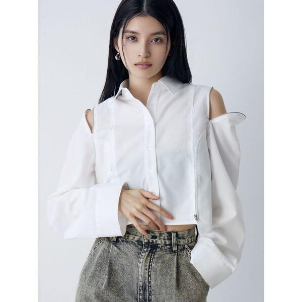 一方、フロントのファスナーを閉じることで、ビスチェ風のシルエットにチェンジ。ウエストをぎゅっと引き締めるデザインになるため、スタイルアップ効果が絶大。トレンドのワイドパンツやカーゴパンツと合わせれば、甘辛ミックスの完成度高めなスタイルに。ファスナーの開閉ひとつで、カジュアルにもフェミニンにも表情が変わるこのシャツです。