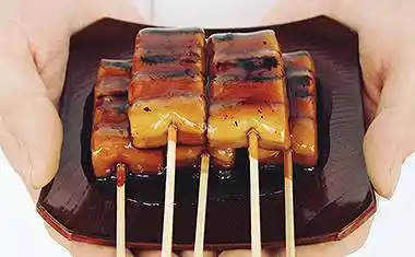 キメの細かい近江米上用粉(上新粉よりもさらに粒子が細かく上新粉よりもさらに粒子が細かい粉)を使った団子は、ほどよい弾力と口どけの良さが絶妙。炙りで香ばしく仕上げたあと、毎日炊き上げる特製タレをたっぷり絡めています。