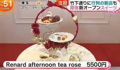 絵本の世界を思わせるバラ×キイチゴをイメージした華やかな店内が特徴の「atelier renard Harajuku」です。こちらのお店で楽しめるはなやかなアフタヌーンティーが大人気です。ローストビーフや旬の野菜スープなど、上の段にはバラ型タルトやカシスマカロンなどが並びます。特に注目は、2種類の小麦粉をブレンドして仕上げる“もちもち食感ドーナツ”。ミルクチョコとラズベリーソースで甘酸っぱさをプラス、さらにかわいらしくデコレーションしています。