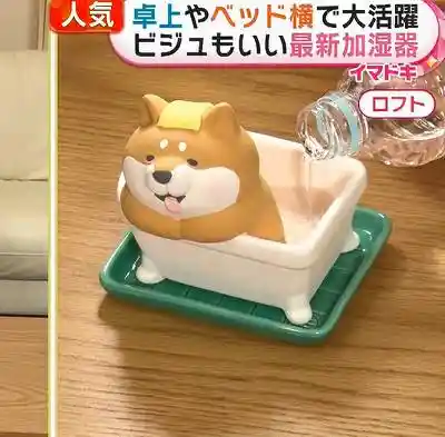 犬が湯船で「やれやれ…」と脱力したような顔。これだけで、もう癒しの勝ち。自然気化式なので、寝室に置いても完全無音。水を入れた皿に陶器がじんわり吸って湿度へ変換する仕組みは、静かだけど確実。寝る前の30分に電源を入れて…とか考えなくて良い。