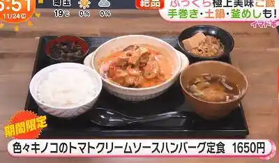 定番の唐揚げ定食や生姜焼きも評判ですが、特に注目したいのが期間限定の「色々キノコのトマトクリームソースハンバーグ定食」。白ワイン・みりん・醤油を合わせた自家製トマトソースは、まろやかで奥行きのある味わい。このソースで、じっくり煮込んだハンバーグはジューシーで、肉の旨味とコクのあるソースが土鍋ごはんと相性抜群です。