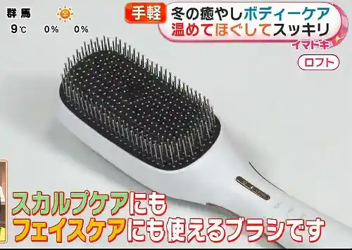 こちらのブラシは髪をとかすだけじゃない、超ハイスペックな電動ブラシです!これ一つで、スカルプケア(頭皮)、フェイスケア、そして通常のブラッシングの3役をこなしてくれるんです。スイッチを入れると、ピリピリッとした電気の刺激(EMS)と振動がスタート。