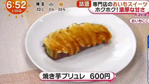 石神井公園にある「おいもここ」で、1日500食以上売れる人気商品です。使用しているお芋は、ねっとりとした甘さが特徴のベニハルカです。焼き芋の上に、なめらかなカスタードを重ね、表面を香ばしくブリュレしています。スプーンを入れると、表面はパリッと、中はとろりとした焼き芋とカスタードが広がります。甘さの強いお芋とコクのあるカスタードが合わさり、デザート感の高い仕上がりで食感の変化が楽しめます。