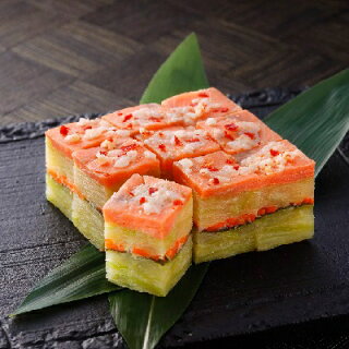 脂が乗った北海道産のサケに塩水につけたキャベツ、人参、麹などを重ねて調味液で漬け込んだミルフィーユ状の断面も美しい重ね漬けのセット。