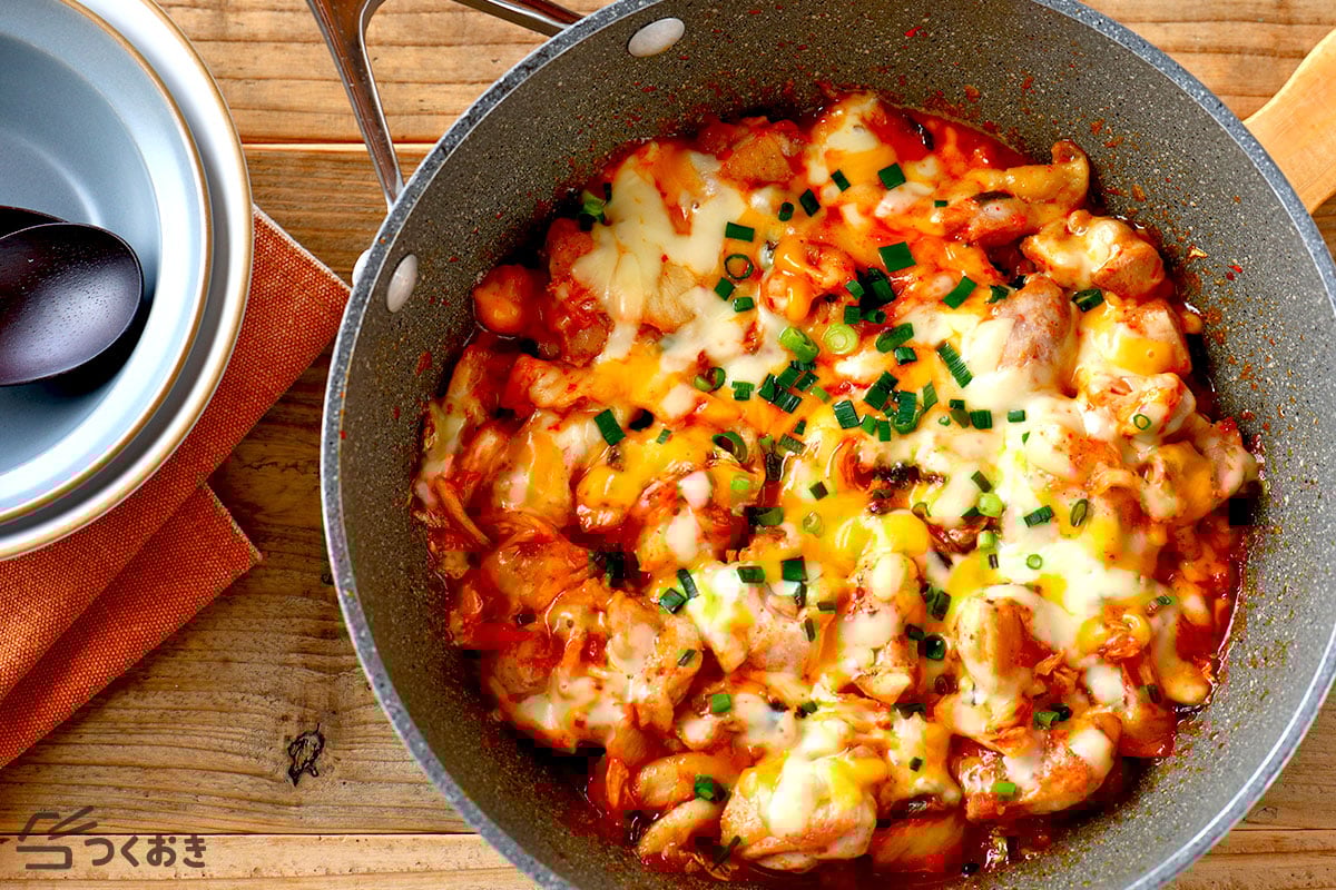 - 鶏肉を炒めて表面に焼き色がついたら、キムチ、みりん、醤油を加えて炒め、チーズを乗せて溶けるまで火にかける。お好みで小ねぎを散らして完成。
