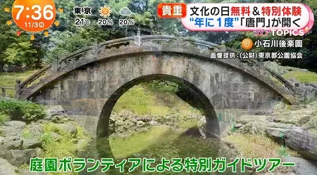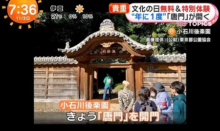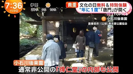文京区の「小石川後楽園」では、文化の日限定で唐門を開門。さらに、普段は非公開の得仁堂の内部も特別公開されます。