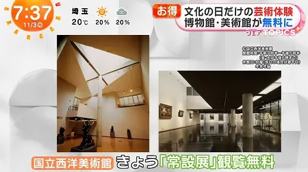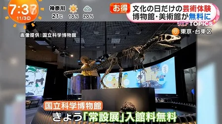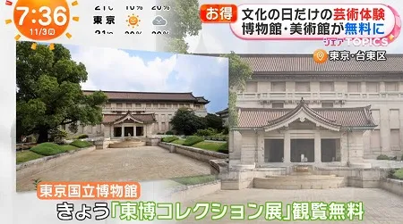 今日、11月3日のめざましテレビ シェアトピは、『文化の日 無料&特別体験』が紹介されました。