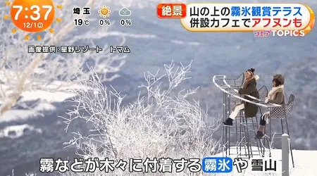ここは ゴンドラでしか行けない山の上 にある展望施設で、霧などが木々に付着して白く凍る「霧氷」や雪山の絶景を眺められる特別な場所です。