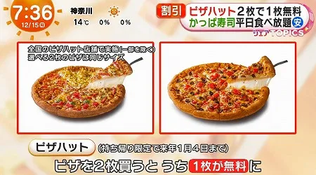 - ピザを 2枚購入すると、うち1枚が無料