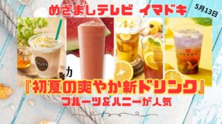 今日のめざましテレビ イマドキ フルーツ&ハニーが人気 『初夏の爽やか新ドリンク』が紹介されました。気温がぐっと上がってきたこの季節、冷たいドリンクが恋しくなる頃ではないでしょうか。今回は、フルーツやハチミツの香りが楽しめる、見た目も味わい...