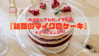 今日のめざましテレビ イマドキ 小さくて大人気!『話題のマイクロケーキ』が紹介されました。最近、小さなサイズのホールケーキ「マイクロケーキ」が話題になっています。ホールケーキといえば特別な日にみんなで食べるイメージですが、このマイクロケーキ...